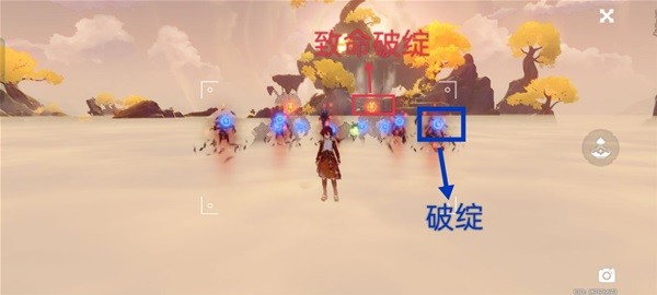 时停超感状态下进入静止拍照状态,可通过缩放与移动镜头,捕捉敌人的破绽(蓝色)与致命破绽(金色),并释放超感技能,对敌方造成高额伤害(金色破绽相当于两个蓝色破绽)。当捕捉到超过八个破绽时,超感技能增强。