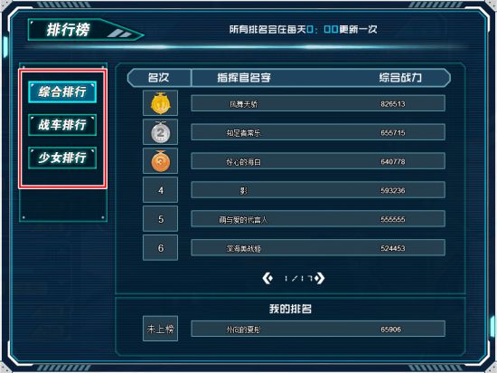 《战车少女》中,排行系统分为综合排行、战车排行、少女排行三种。每一种都可以看到前100名和自己的排名,100名之后显示“未上榜”。
