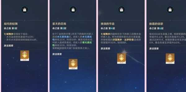 1命:提升水月伤害 及 水环时间,作用不大,需要注意水环的时长与「金杯的丰馈」无关,不建议抽取。