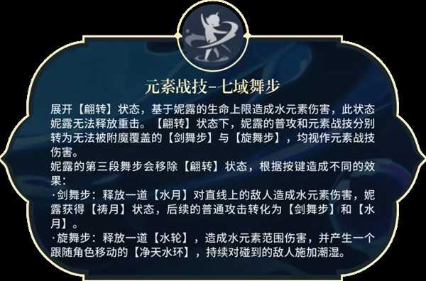 1、连按3次E,即完成释放【旋舞步】,产生一个水环(类似芭芭拉,但范围要大),每2秒进行一次弱水附着,水环无伤害。