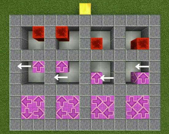 如图,就以最简单的箭头图案方块为例,金块的位置是你摆放第一个方块时面朝的方向,红石块是你摆放第一个方块的位置,箭头所在的位置是下一个方块所摆放的位置,箭头的指向是摆放下一个方块时玩家所朝的方向,顺时针和逆时针摆放可以摆出更多的图案,以此类推。