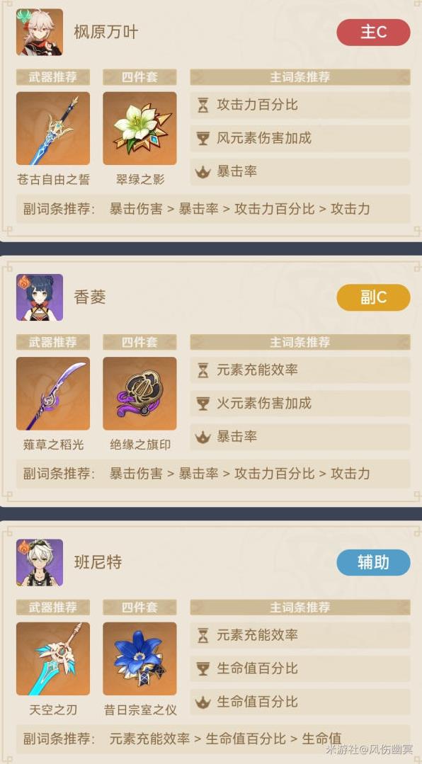 班尼特回血加强香菱输出,也加强万叶的技能,给万叶挂火。圣遗物攻风暴万叶自己打自己的风伤,全队专用技能的玩法,砂糖增精通聚怪减抗,万叶聚怪风伤扩散,如果班尼特满命,万叶可以偶尔普攻打打火伤,因为万叶普攻是必须升级的,可以用用。