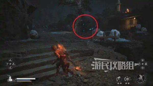 沿路走到头在右侧可以看到一个木板,从木板处往下跳,走楼梯上坡往前方建筑中间的树方向走。