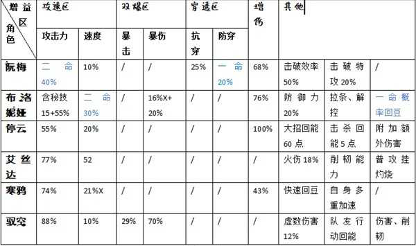先是角色搭配方面,这里先列些出有关于辅助角色的一些相关信息,以便直观得比较出各类配队方面的合理性(五星主要以0命技能为基础,四星以满命技能为基础)