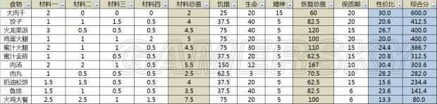 在不考虑大肉干的情况下,饺子的综合评分最高,其制作要求为“1肉、1蛋、1蔬菜、1填充”,则可以等价为“2怪物肉+1蔬菜+1填充”,确实是居家旅行、杀人灭口的佳品。