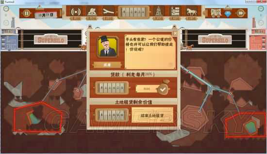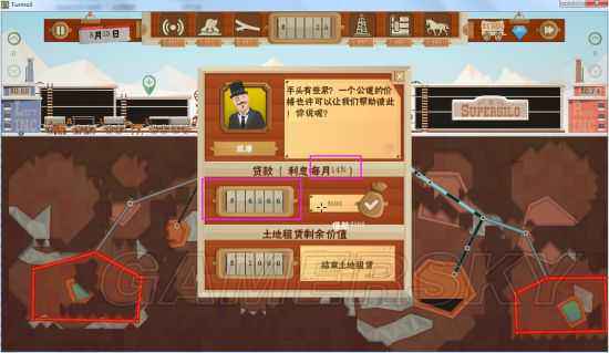 一开始,肯定是没什么钱,由于是雪地,前期越快找到气越好,于是开始贷款,这时可以看到,我没钱了,左边是0.83,我没选择卖油,选择贷1000,利息每月8%,也就是最后要给电脑80*12=960元。