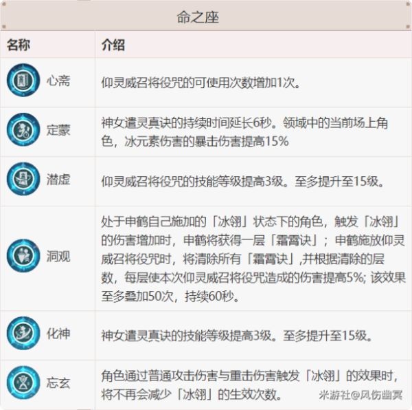 四命:触发「冰翎」叠buff加强申鹤E技能伤害。(类似优菈、雷神等叠层数提高伤害)