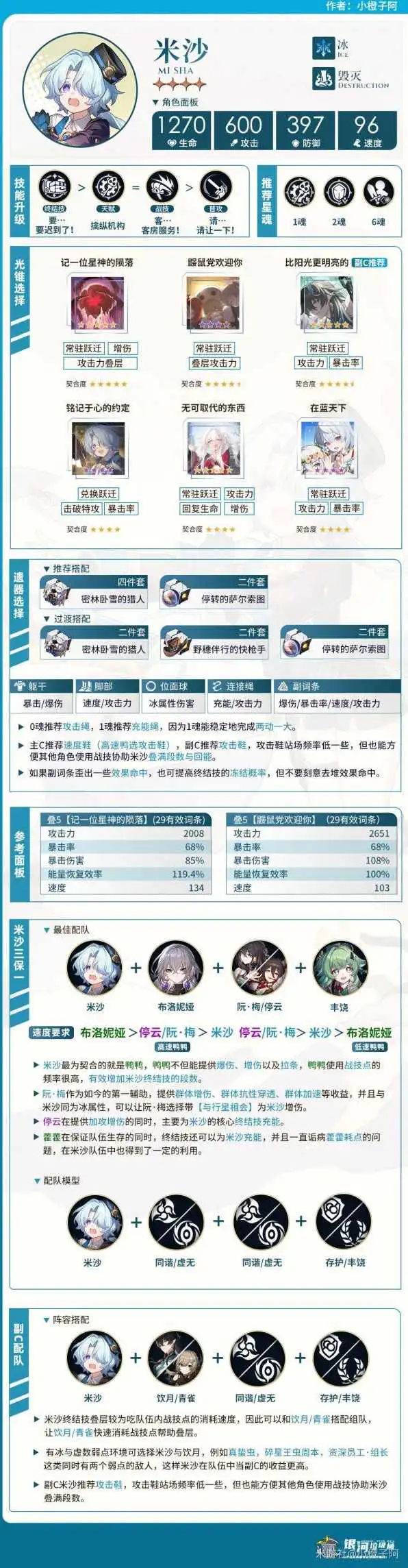 《崩坏星穹铁道》中米沙是2.0版本新增的4星输出角色,很多玩家想要知道他的技能该如何选择,下面请看“小橙子阿”带来的《崩坏星穹铁道》米沙一图流培养指南,希望能够帮助大家。