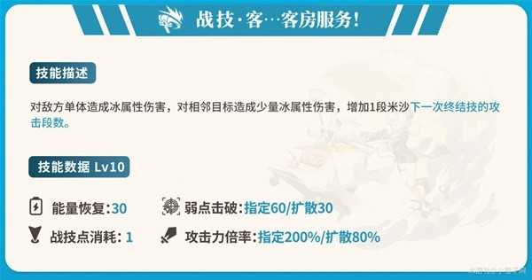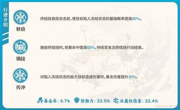 ①终结技:米沙核心技能,升级提升大招伤害,以及每段结算冻结的基础概率,优先升级,建议点满。