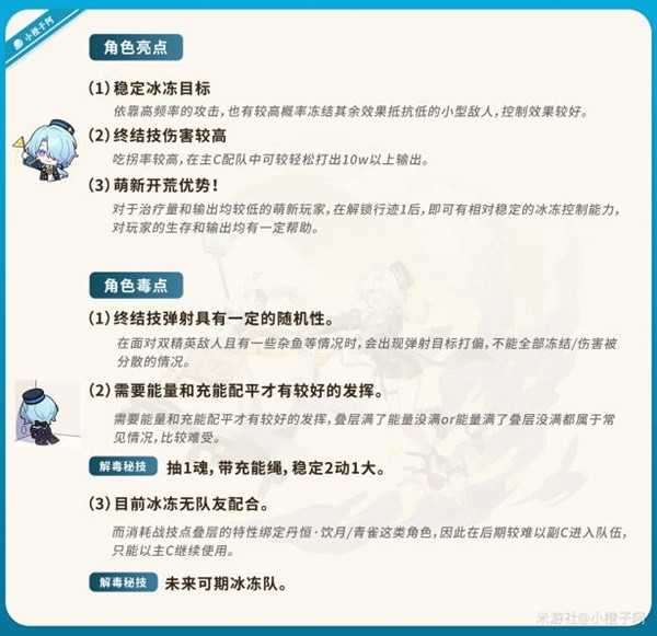 米沙技能倍率较高,但是增伤乘区较少,且由于输出依靠大招爆发集中,因此吃拐率较高,拐后终结技可以轻松地打出10w以上的伤害。由于现在还没有冰冻队(终结技带冻结效果),推荐新入坑的萌新可用米沙作为主C进行配队。