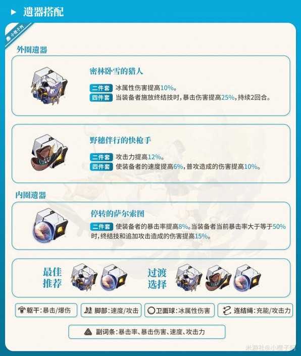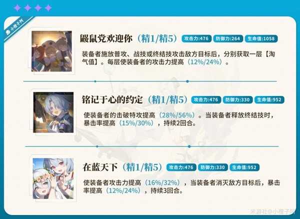 这里我需要格外说一个角色—寒鸦,米沙需要高频释放战技,就需要全队高频释放战技协助米沙叠加段数与回能,寒鸦可解决战技点不足的问题,其次寒鸦天赋的增伤、终结技的加速与加攻均可提高米沙的输出收益。