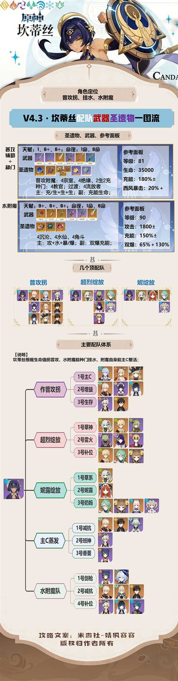 《原神》4.3上半的卡池中还有四星的坎蒂丝,这是一名水属性的角色,可以辅助,可以附魔挂水。下面请看由“婧枫赛赛”带来的《原神》4.3坎蒂丝出装配队培养一图流,一起来看看吧。