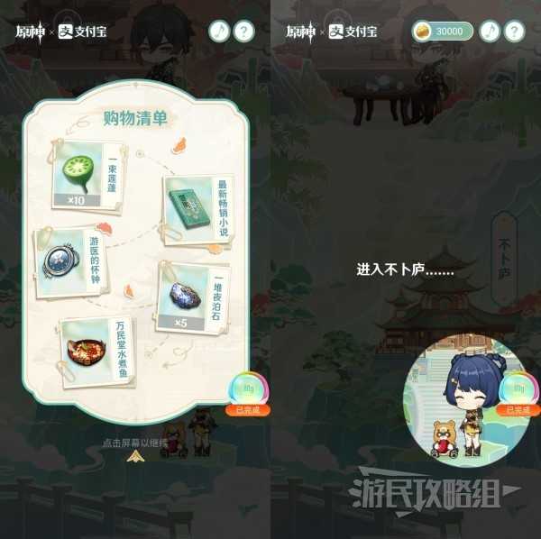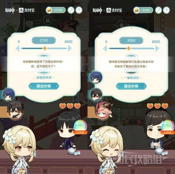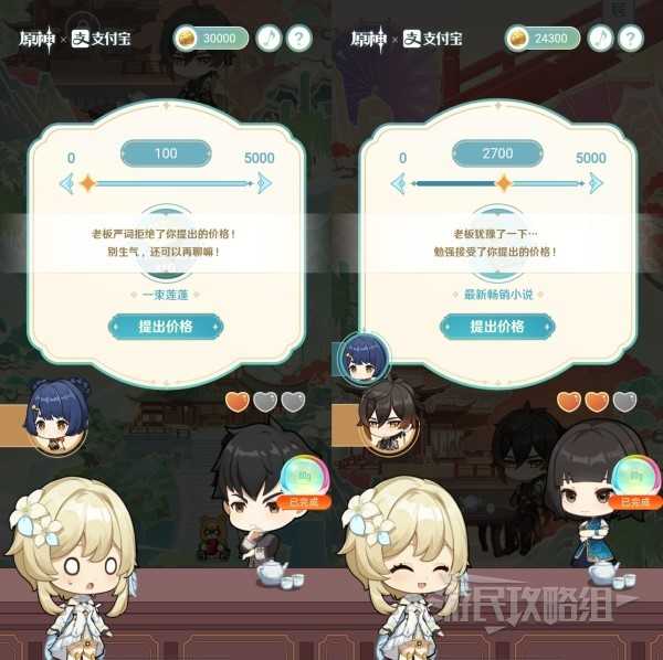 活动中玩家会获得30000摩拉作为旅行资金,需要通过讲价(还价)用较低的价格购买到下方图片所示的物品。在购买不同的物品时适合的讲价助手可以帮助还价,有适合的助手时会出现提示。