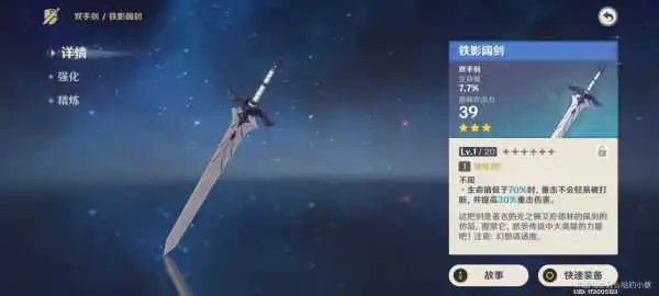铁影阔剑,主词加生命,技能高于百分之70时重击不会被轻易打断!并且提升重击伤害。