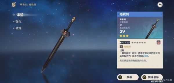 暗铁剑!【璃月卖吃鱼刀鱼大哥哥那里获取】主词元素精通,技能;触发超载,超导,感电,或者雷元素扩散后的12秒内攻击力提升【适合凯亚,行秋,刻晴】目前只能获取一把!值得收藏。