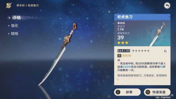 吃虎刀鱼,主词攻击力,技能;命中敌人时有50的几率对单体敌人造成高额伤害!CD15秒精炼会减少CD时间【适合所有输出位的单手角色!】3星传奇武器之一。