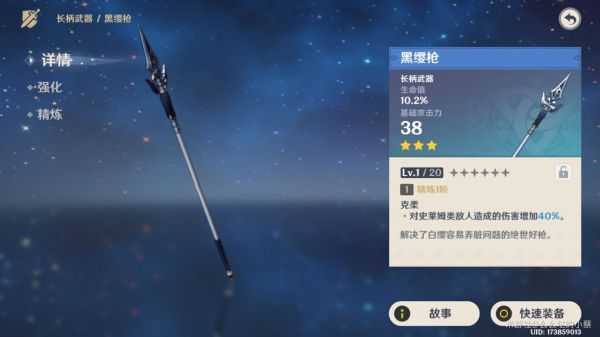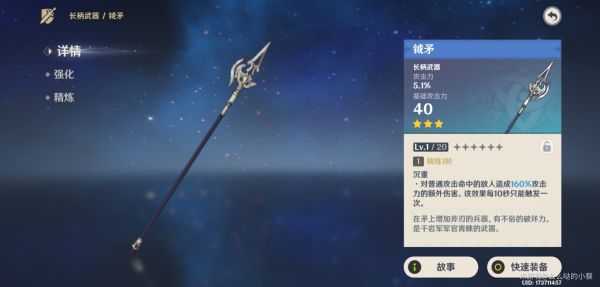 不识字qwq就叫他矛吧,主词加攻击,技能;普攻命中敌人可以对其造成高额伤害10cd一次精炼不会减少cd时间【适用所有长枪角色】3星传奇武器之一。