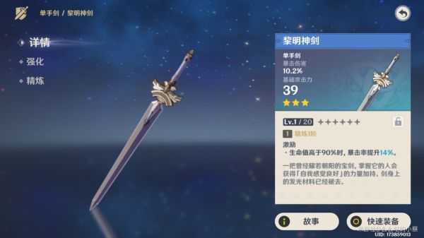 黎明神剑,主词爆伤,技能;自身生命高于90的时候暴击率提升【适合所有单手剑输出主角色过度】3星传奇武器之一。