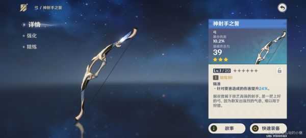 弹弓,主词加爆率,技能;普攻和重击在0.3秒内射到敌人,造成的伤害提升,如果超时就会下降百分之10,适用所有射手,效果杠杠的【如果要发挥他的所有加成效果就要贴脸射】而且他加的爆率也挺诱人的。