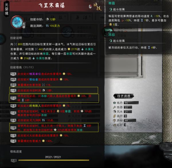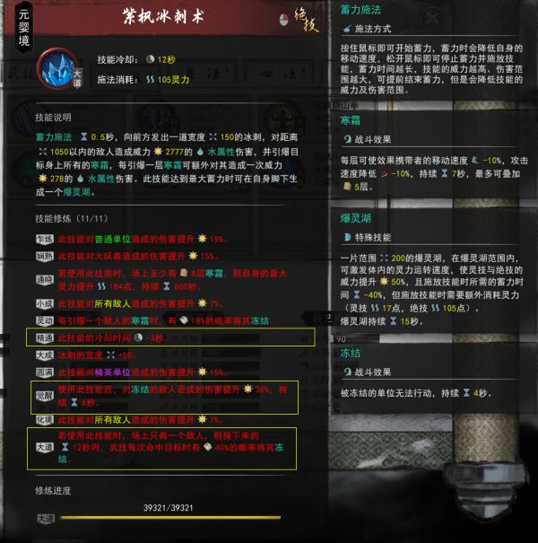这也是这个流派的生存核心,词条选对可以轻松做到“控到死”,最完美选择是寒霜爆,但需要配合刀大发的减绝技CD才能无限控制,要是刀大发没有绝技减CD的话可以用冰刺术。具体词条选择我放在下面了,老规矩黄框必备。