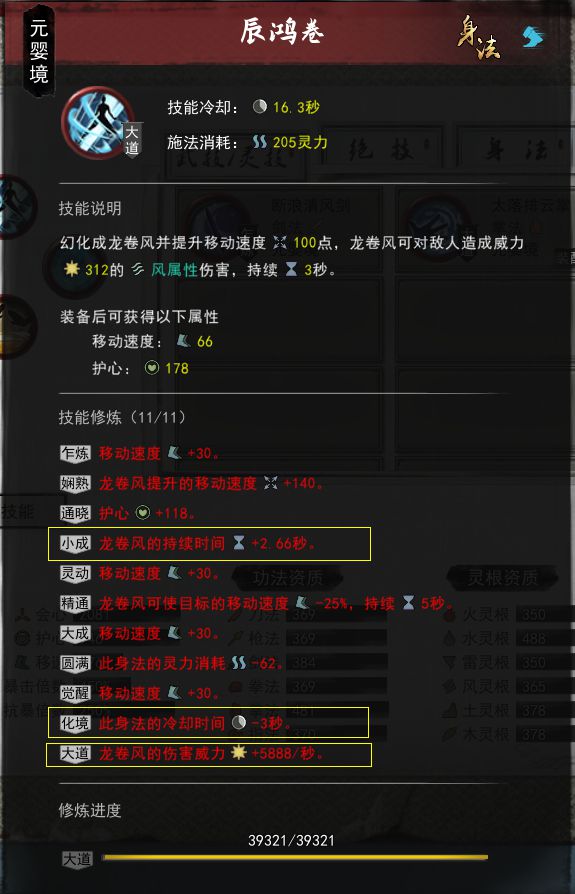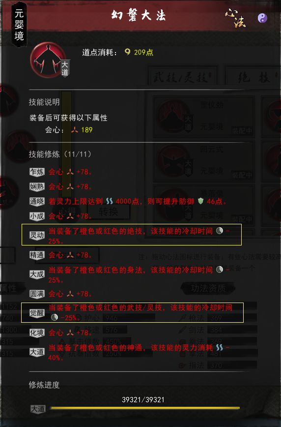 最后提一下,这个流派之所以说它完美成型难,不止是用的心法种类多,必备词条多,而还需要词条基本需要参悟完美,我全部完美参悟配武道精通才能做到”102%“的减CD,稍有一些不完美就就做不到0CD了,有一点CD和0CD的体验还是很不一样的,要坚持无修改通洪荒的还是需要慎选。