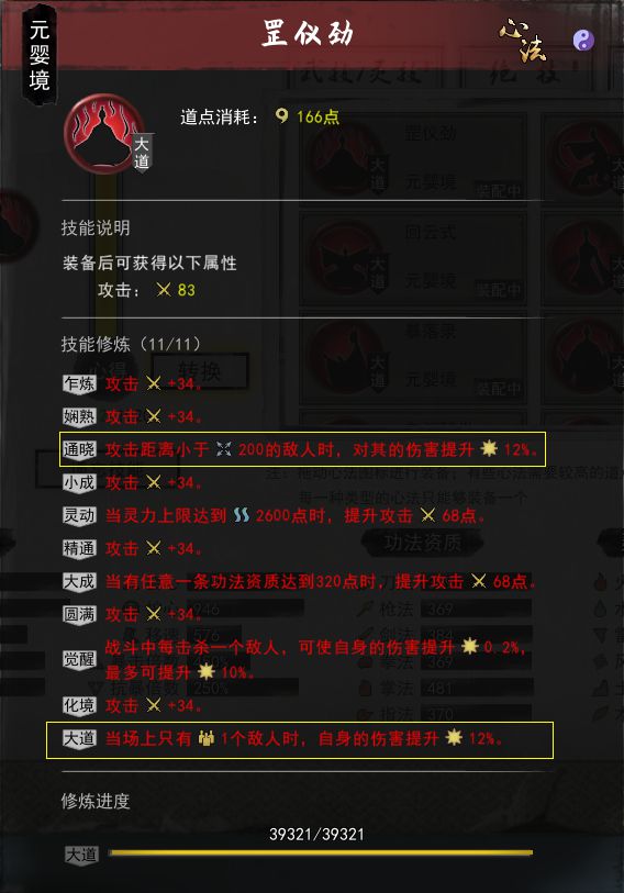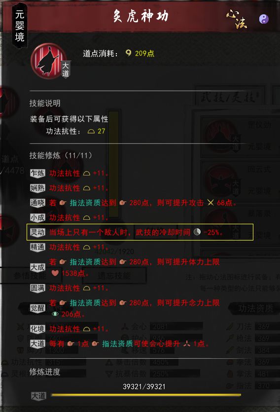 心法也是该流派的重头戏,有些词条比较凑,而且选择是众多流派的大杂。先从“神功”说起吧,它选择为指的心法关键词条为“一个敌人时武技CD-25%”图在下方