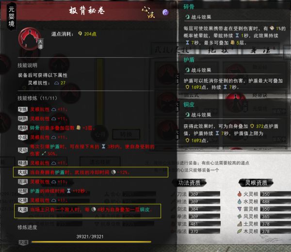 选择为拳系的内功,关键词条为“有护盾时武技-12%CD”和“只有一个敌人时每4秒给自己增加铜皮”(假如灵力内功有使用技能给自己加护盾的词条,可以无视第二个词条)具体选择见下图