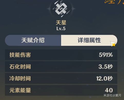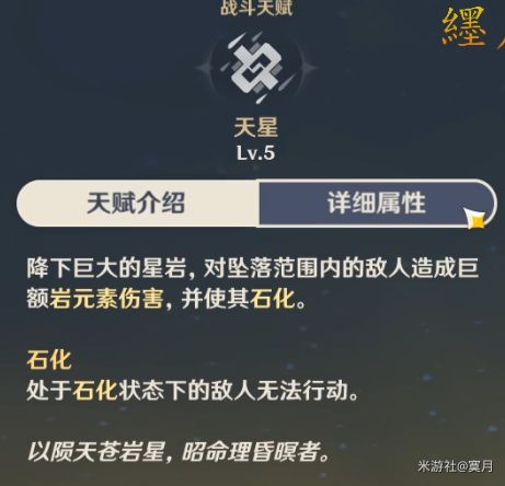 大招是落下一颗陨石,范围石化3.5秒,伤害和钟离生命值有关(60级突破天赋)