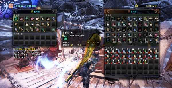 带的各类药,秘药、大回复药和大生命粉尘的调和材料也带满了,进去再拿10个支给大回复药和2个支给大生命粉尘,相当于带了30个大回复药4个大生命粉尘,再配合满足感极意,基本上可以够一局的用量不用回去补给,秘药+大秘药加起来带了3个,奶妈不容易被打到,所以这个量基本够自己用一整局了。