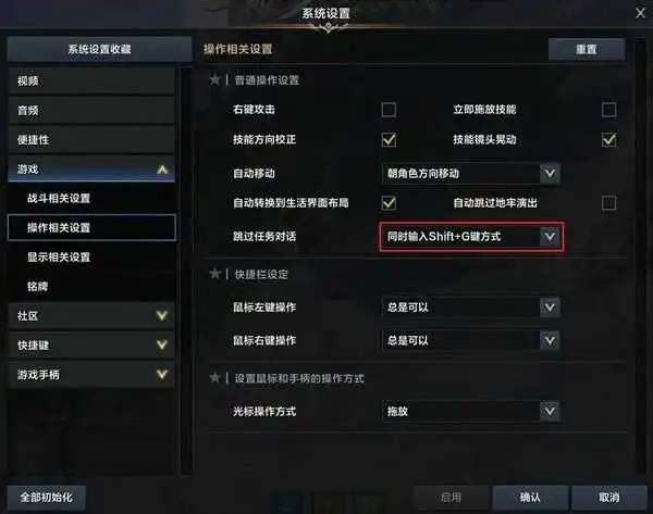为了满足冒险家们在跳过对话时的不同习惯,我们在系统设置中增加了长按G跳过对话的选项。具体位置在游戏页面右下角按钮【设置-游戏菜单-系统设置-游戏-操作相关设置】中,新增调整跳过任务对话操作方式的选项,冒险家们可以在此选择长按G的方式来跳过对话了。