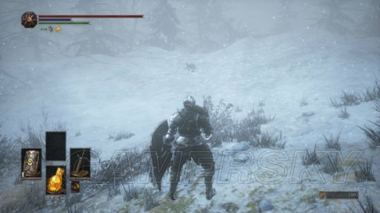 1.进入DLC后往前走出山洞就能到雪原并看见篝火,往右前方走会看见一片冰地,过去会坍塌下面有不少狼群。先往右侧会看见一头狼,然后顺着山坡往上走会看见四个敌人,敌人后方有武器幽魂投枪。