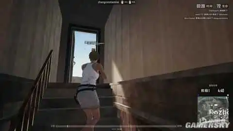 上述是在房屋内平地上战斗,那么在房屋内楼梯处战斗我们又该怎么办呢,如图,这样的房屋结构十分常见,不论是上楼还是下楼,一推开门就可能遭到敌人的猛烈攻击,解决的第一种方法,开门后,原地等待三秒钟,然后迅速冲出去环顾四周,最好在起跳的时候,就将四周环境侦察好,若有敌人,在空中到达最高点的时候就将敌人淘汰,速度一定要快。第二种解决方法,开门后以不变应万变,原地不动,等待敌人露出脚步,我们进行下一步的行动。