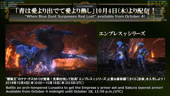 详情:历战王炎妃龙即将在2018年10月4日~10月18日正式登场,讨伐历战王炎妃龙可以获得其γ套以及一套外观装备~