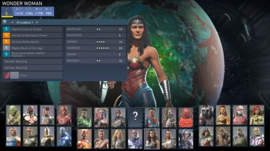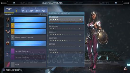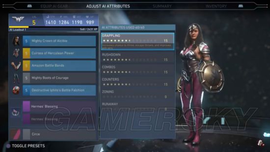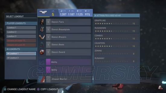 在characters里选一个想要升级的角色,比如说神奇女侠,然后在loadout里选择AI Loadout1 再按手柄的R1键 挑出AI attributes的数据。