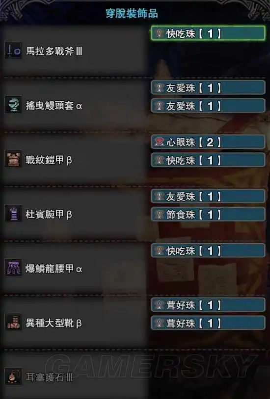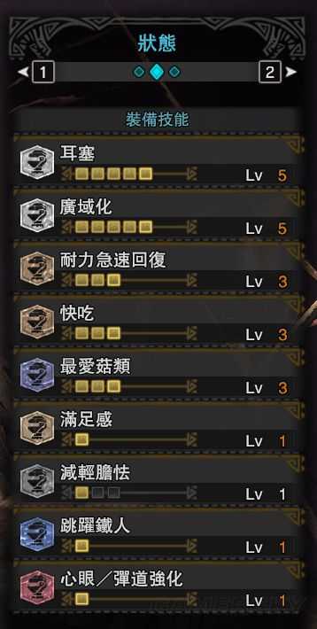 耐力急回是送的,高耳中毒贼舒服,还能特定时候扔扔闪光,满足感可以节省不少药,跳跃铁人偶尔在跳斩骑怪的时候有点用,也是个送的。刚好出了一个心眼珠子,插上效果拔群。下面是最重要的一个技能!!试了很多腿,最后选择冥灯的腿,一点减轻胆怯,组队不要太爽,妈妈再也不怕被太刀削膝盖了(打尸套龙的时候换上尸套腿)