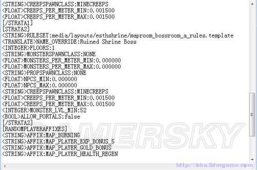 <INTEGER>MONSTER_LVL_MIN:52 :貌似在这没什么用,可能只是规定BOSS等级至少为52级,也就是只对最低等级的MAPWORK地图有效.可以尝试更改这个数值,使其对某块地图所有怪物生效,不过我没试过,欢迎尝试.
