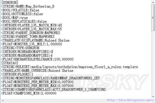 先说一下文件结构吧,以[]框起来的部分是用来说明文件结构的.比如[DUNGEON]和[/DUNGEON]之间的内容为定义这个地图.内部还嵌套有很多这种结构,从名字上就可以大概知道其中定义的是什么.