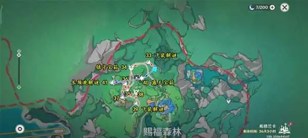 35、35号宝箱与36、37、38宝箱相关联。靠近35号宝箱,等待飞鼠散开后,分别完成36-38宝箱解谜(顺序可随意),三处宝箱解谜后,35号宝箱自动解锁。