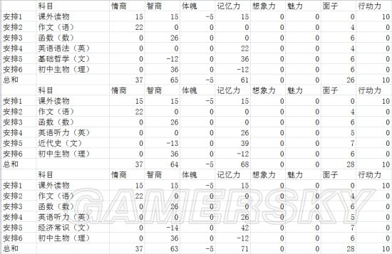 在安排方面,六个安排全都安排“课外读物”,一些安排收益如下图,毫无疑问,各方面收益是全安排“课外读物”最好。