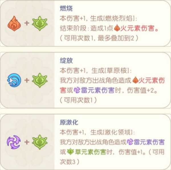 草+水,绽放,生成草种子,被雷、火伤害激活时,使其伤害+2