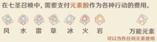 角色攻击/使用技能,以及发动卡牌效果时,会消耗对应属性的骰子,如无颜色说明则是任意骰子,如无数字则是不消耗骰子。