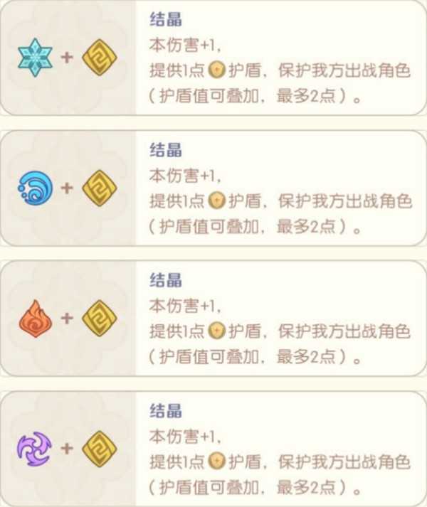 岩+任意,结晶,伤害+1,给出战角色自身产生1点护盾(最多2点)