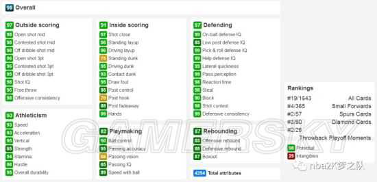 这张钻石伦纳德才是本次更新的最强卡牌,在被渣渣垫脚之前他可是MVP级别的存在,大家可千万别忘记这一点。钻石卡哇伊的总分为4254点,在目前所有钻卡中高居第三。首先他拥有着相当稳定的投篮能力,98中投毕业级、96三分准毕业级。此外,他的内线终结能力也异常强大,95突扣+93隔扣+95弹跳,还有95的造犯规和罚球,使其在进攻端难以被完全锁死。