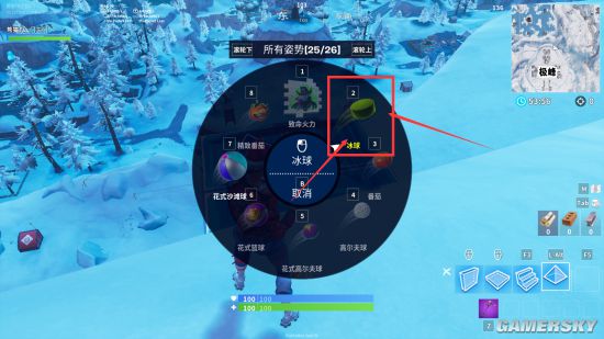 冰球是一个互动性动作,大家在游戏中按B键即可找到(鼠标滑轮可以上下切换)这里三门建议大家在高山(极峰、五指山)或者冰面上去扔,多试几次,很容易完成。