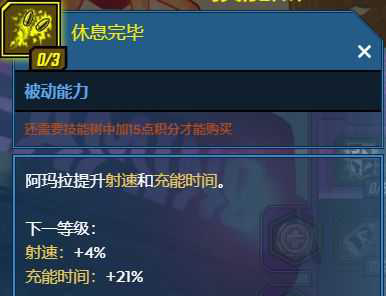 4-1 休息完毕(3):每级提供0.26的充能速率加成和0.04的射速加成。充能速率的加成可以大幅提升高充能延迟的马里旺武器的输出占空比,3级0.12的射速加成对高射速武器加成也还行,总体来说是提升输出频率的好技能,强化高频火力压制能力。