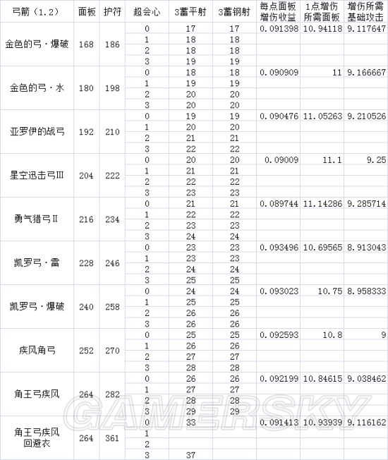 2、第二、第三列,是属解弓的基础物理面板,以及带上道具栏的攻击buff道具后的物理面板。