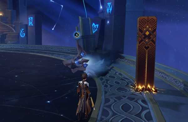 2.钟离短E放在第一个狗头旁边,注意是旁边,不是重叠在一起不然柱子会消失,等柱子后续共鸣就能累积破狗头所需的元素量;