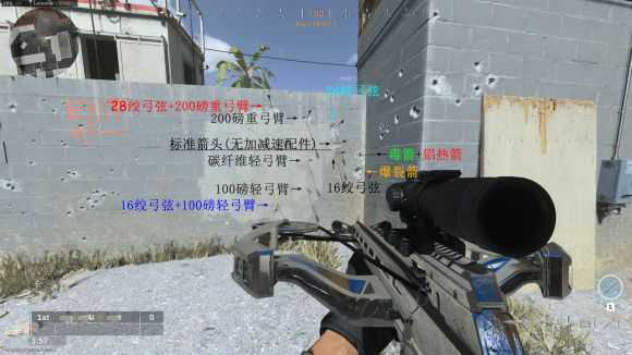 选取一张各位熟悉的地图"攻坚练习场"作为测试地点,测试方式为在墙头上瞄准另一边墙头(相距60M左右)射击并观察装配不同配件的弩箭命中位置与墙头顶端的垂直距离,希望能给还在解锁弩箭迷彩的玩家或者弩箭爱好者一个直观的感受。