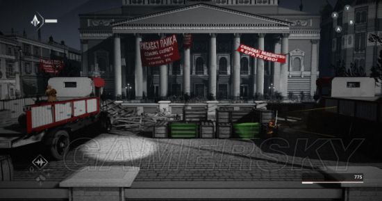 本作的双主角设定也算是一个小小的惊喜,作为一号主角,我们的尼古拉大叔除了烟雾弹之外,还有一把步枪和一个类似钩子的机械绞盘。一开始笔者还担心,步枪这种强力的远程武器会不会影响游戏的难度,但后来发现担心是多余的,在AI巡逻模式下一旦被发现依旧死路一条,一切“刚正面”的方式都是行不通的。另一方面,本作中敌人的能力也升级了,烟雾弹这种道具已经不适用所有战斗了,人家红军带上面罩后,轻松在烟雾中射爆你的蛋。绞盘是个很有意思的工具,也算是工业时代的产物吧,它既能当做抓钩来拉扯机关,也可以通电充能来破坏敌人的电力系统。