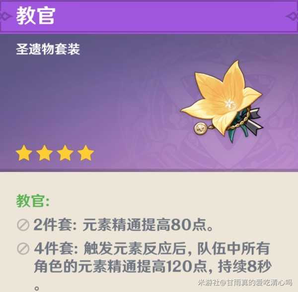 萌新过渡可选,教官可以增加琳妮特的精通,并且释放完元素爆发后触发扩散反应,可以给全队增加元素精通。